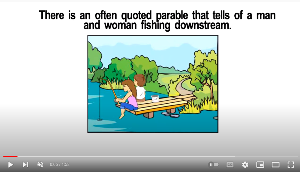A doctor, a nurse, and a teacher are walking down a riverbank. They all notice that a child is floating down the river, screaming for help. The nurse helps pull the child out of the river and the doctor treats any injuries the child has… Soon after, they hear more screams from the river. More and more children keep floating downstream.